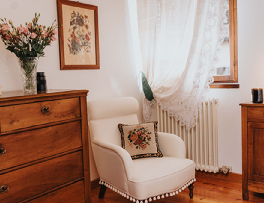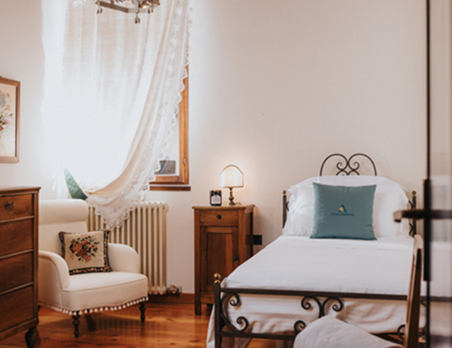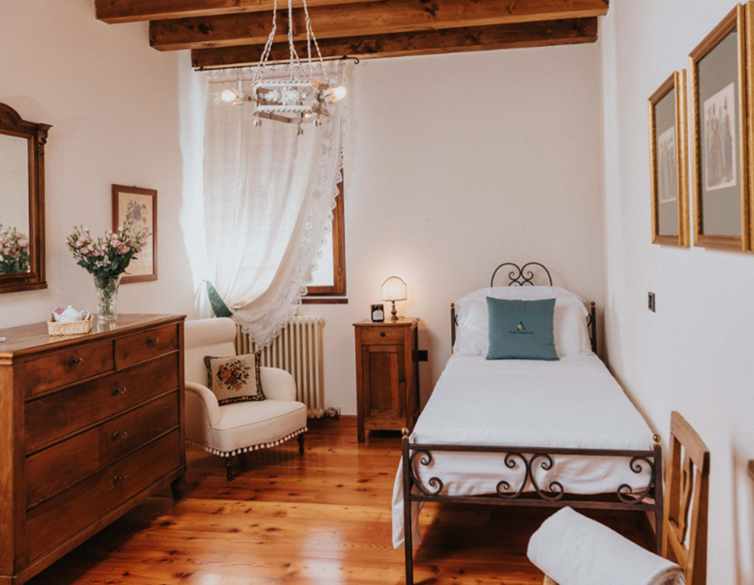 Single room overlooking the courtyard, with exposed beams, in a classic, romantic style, with private external bathroom.